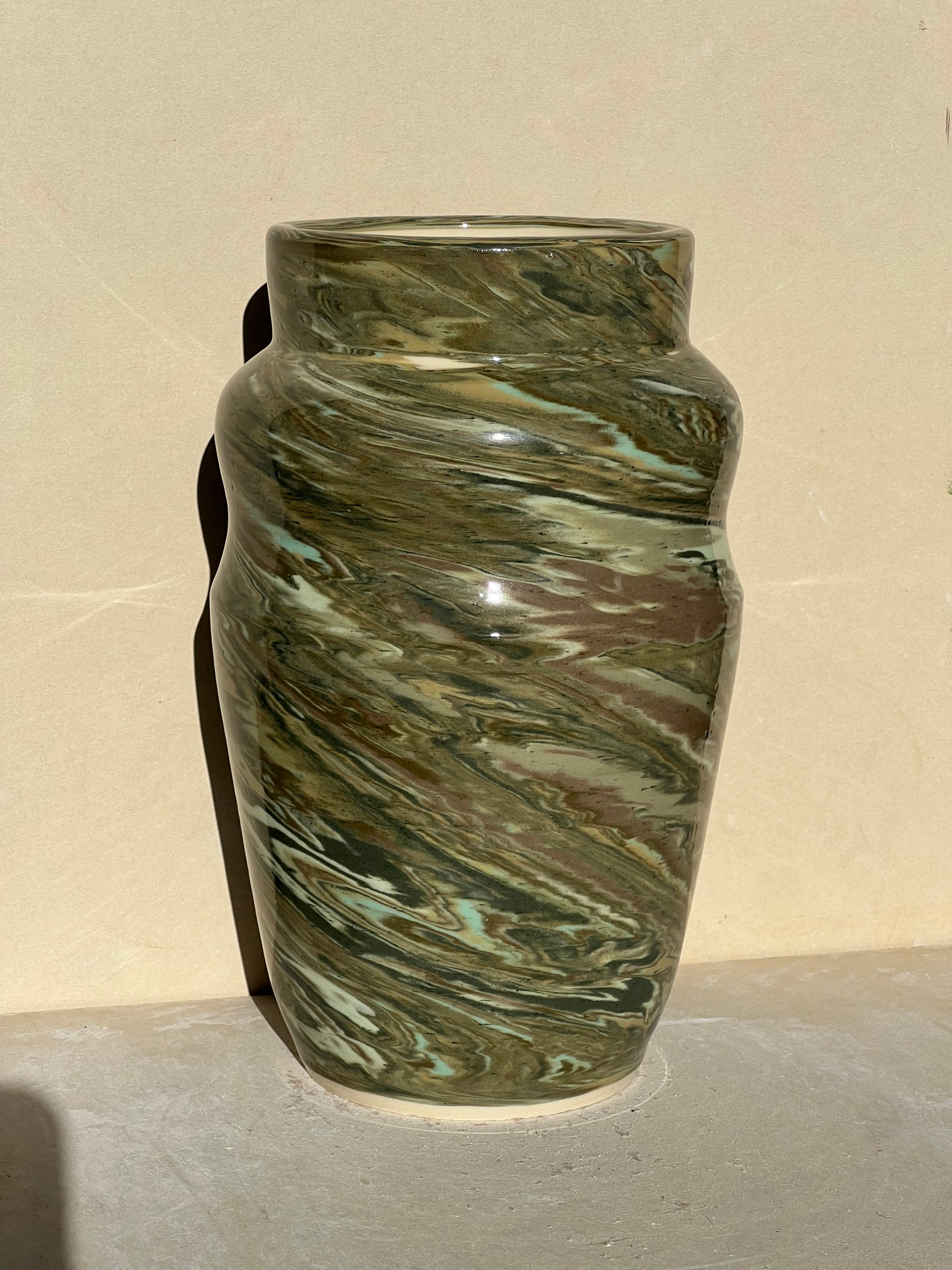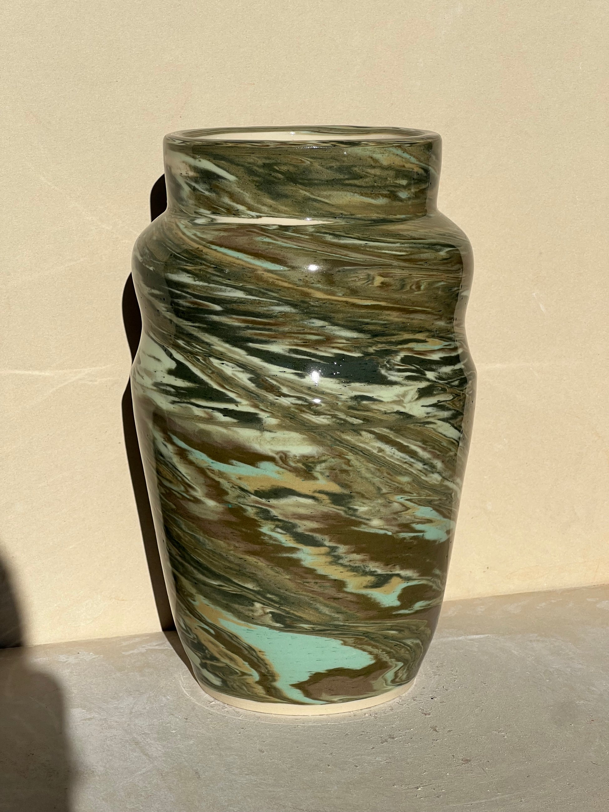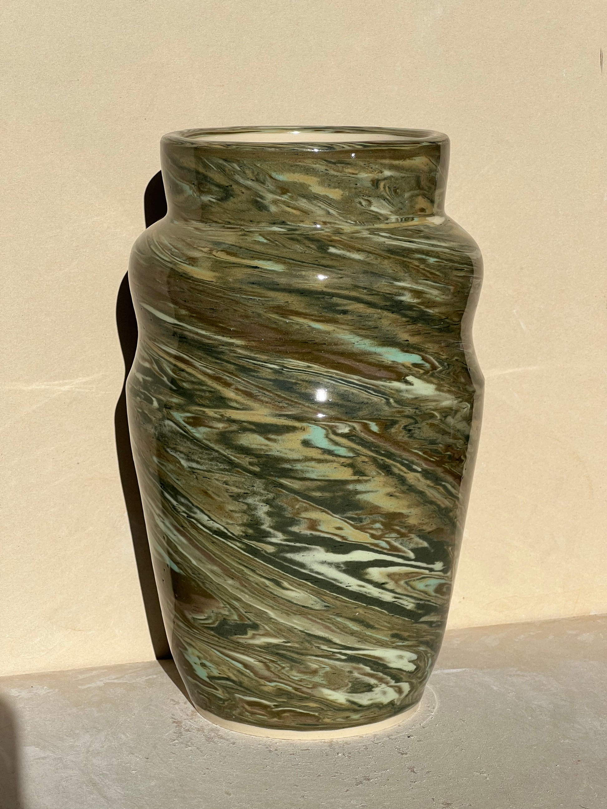 Made with a green marbled nerikomi pattern of all my green clays. Pattern was made using 56 different layers of green