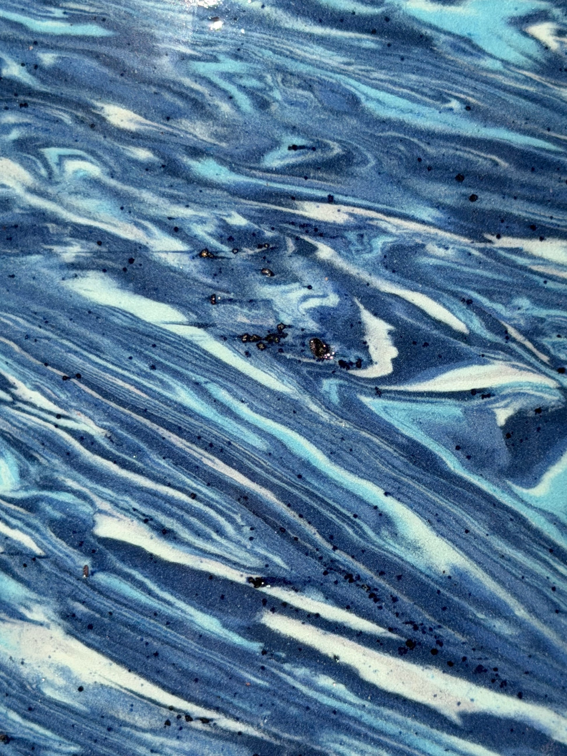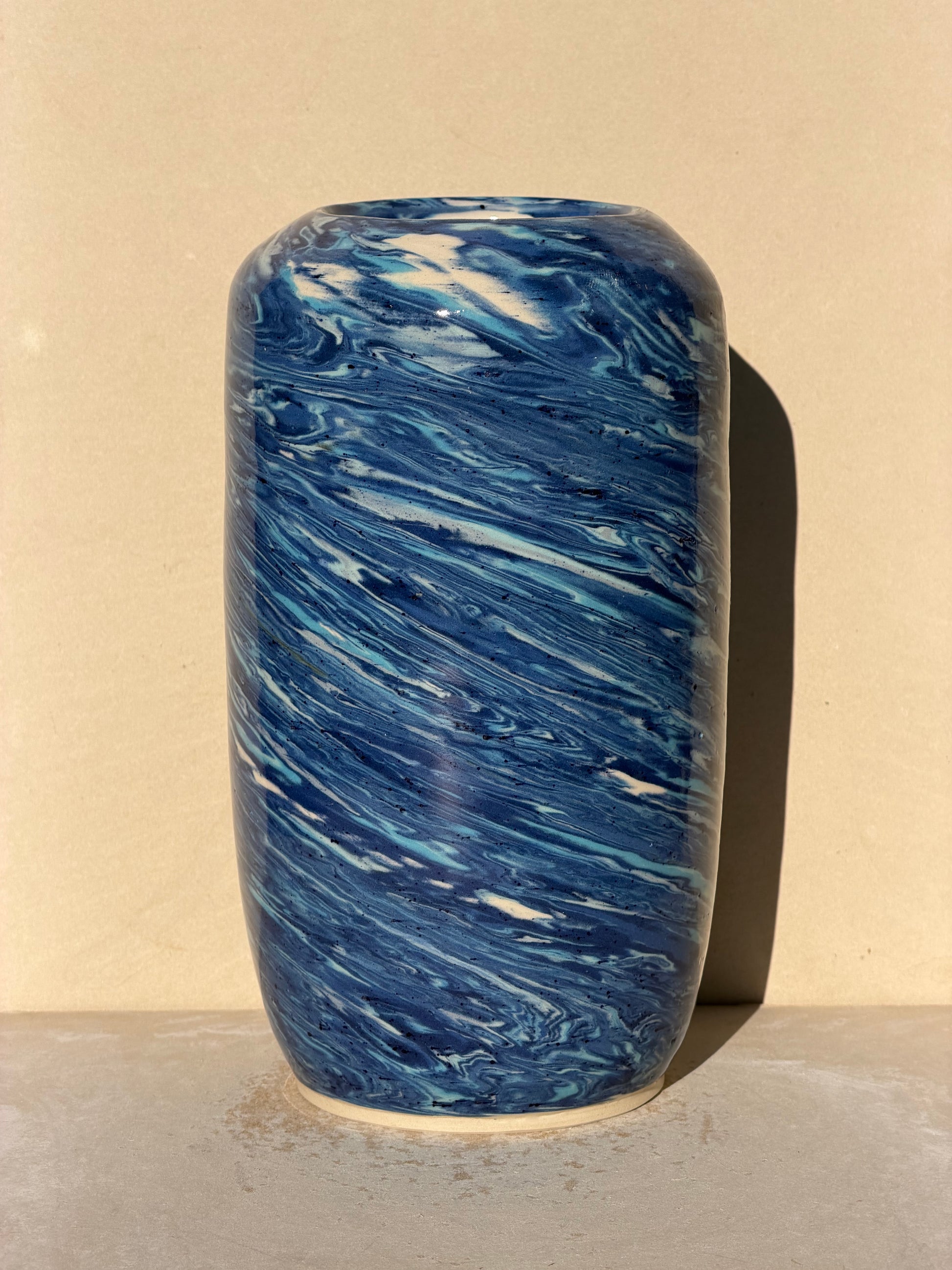 The pattern was formed from a collection of clay scraps left over from another body of work. After rehydrating the trimmings and reforming them together, a nerikomi pattern emerged. The trimmings I used for this one were composed of 11 different blues.