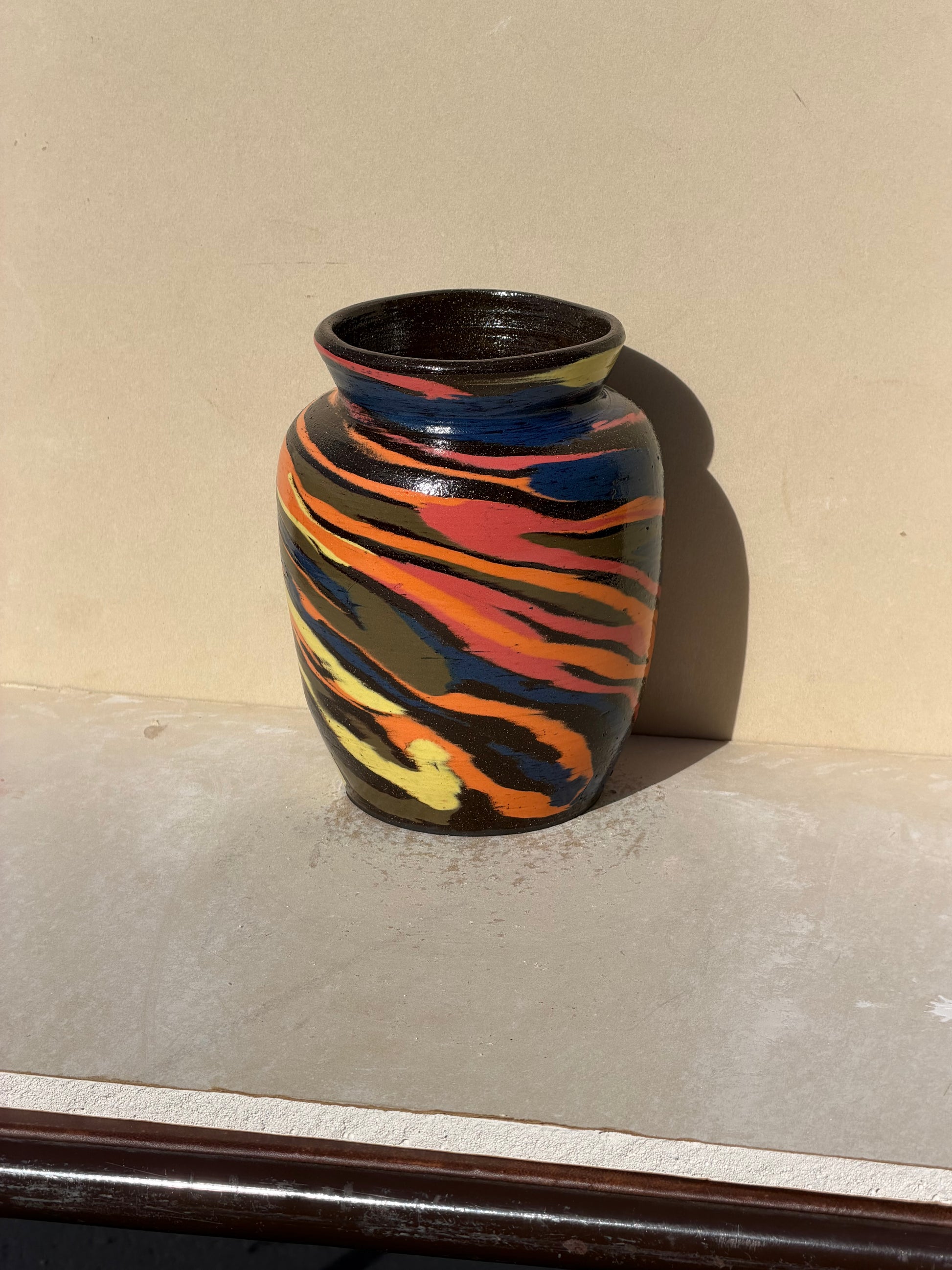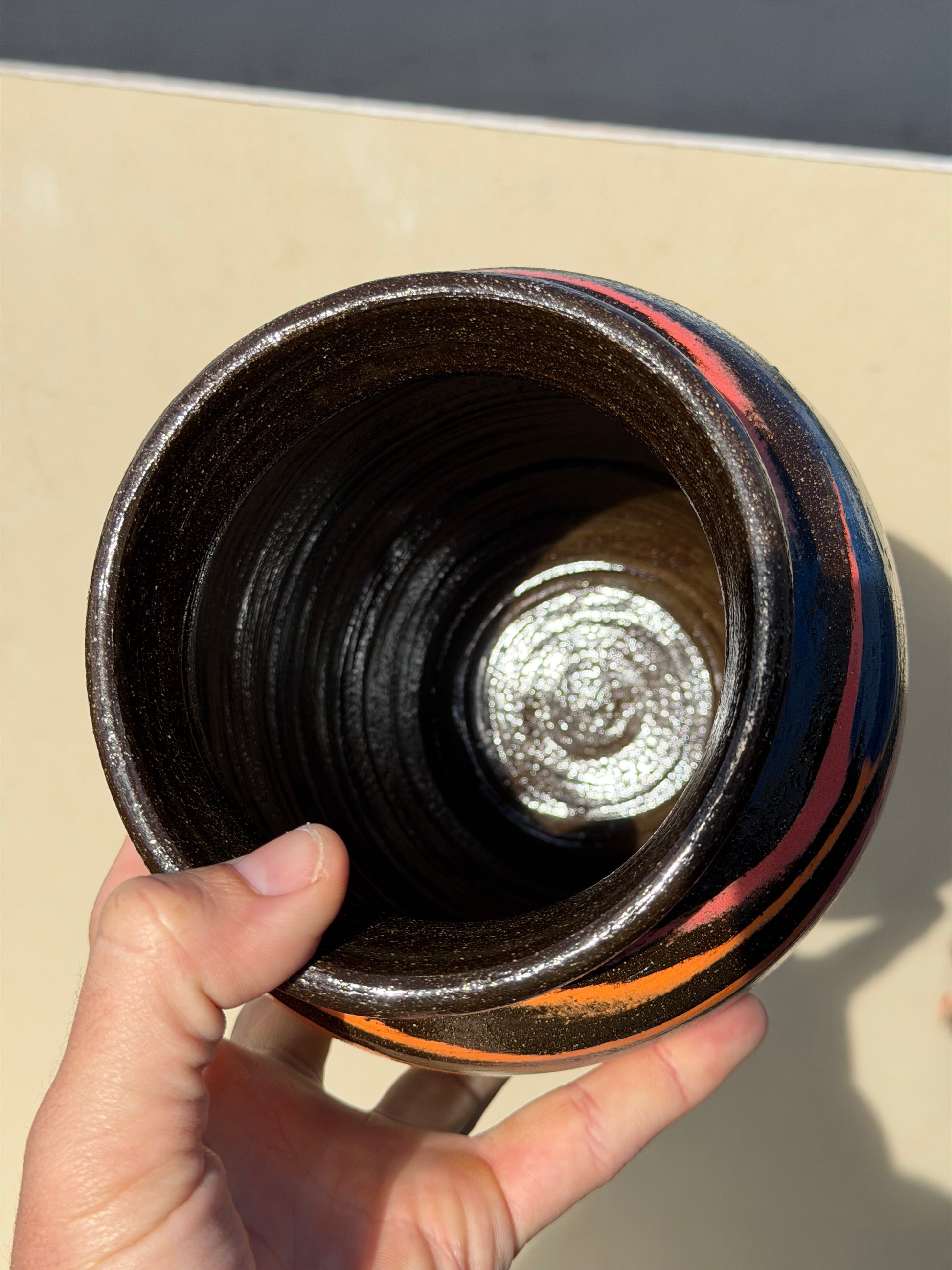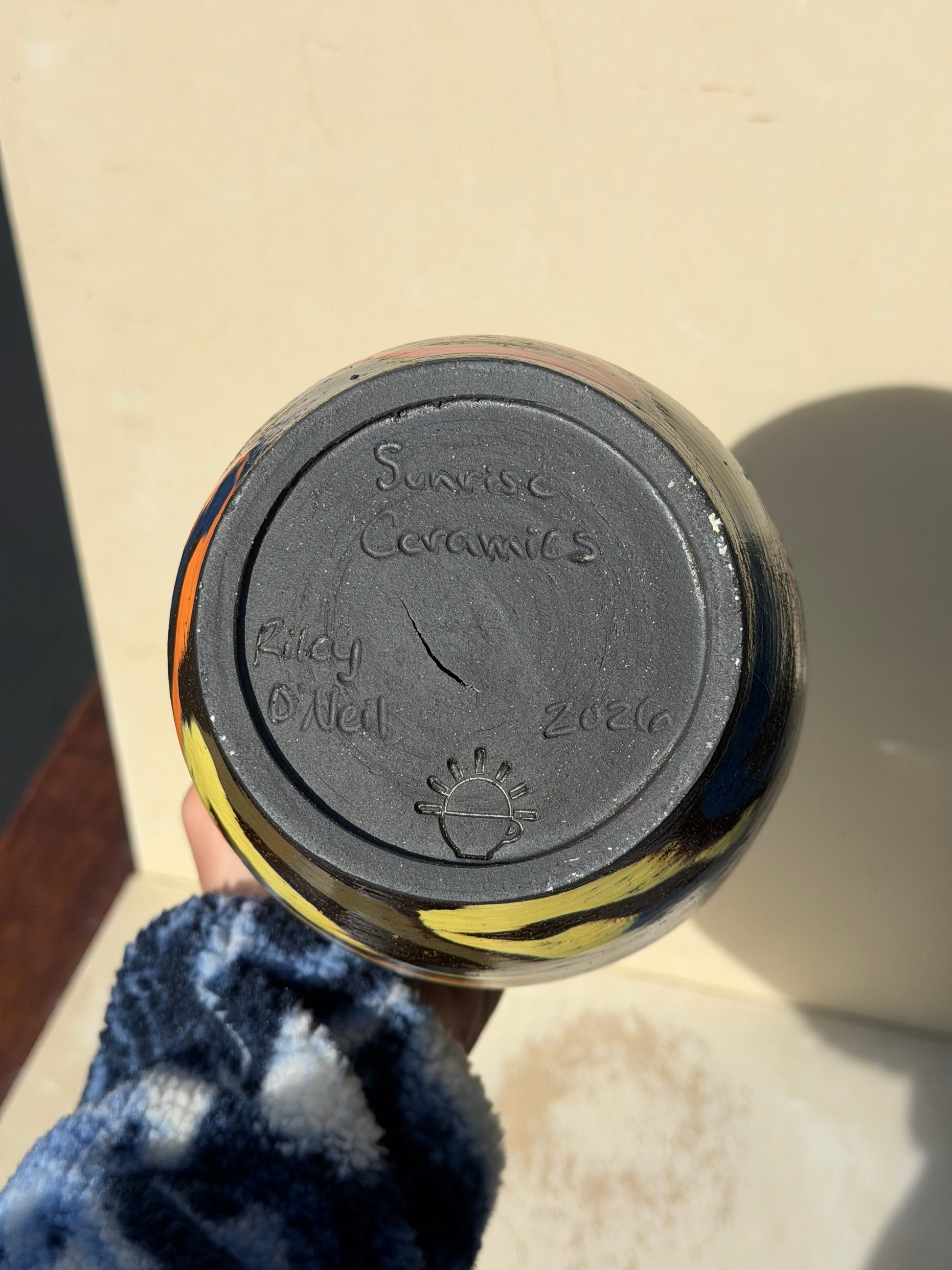Created using a brown clay base. I carved out a design of circles and filled it in using many colored clays. crack does not go all the way through, piece is still water tight.