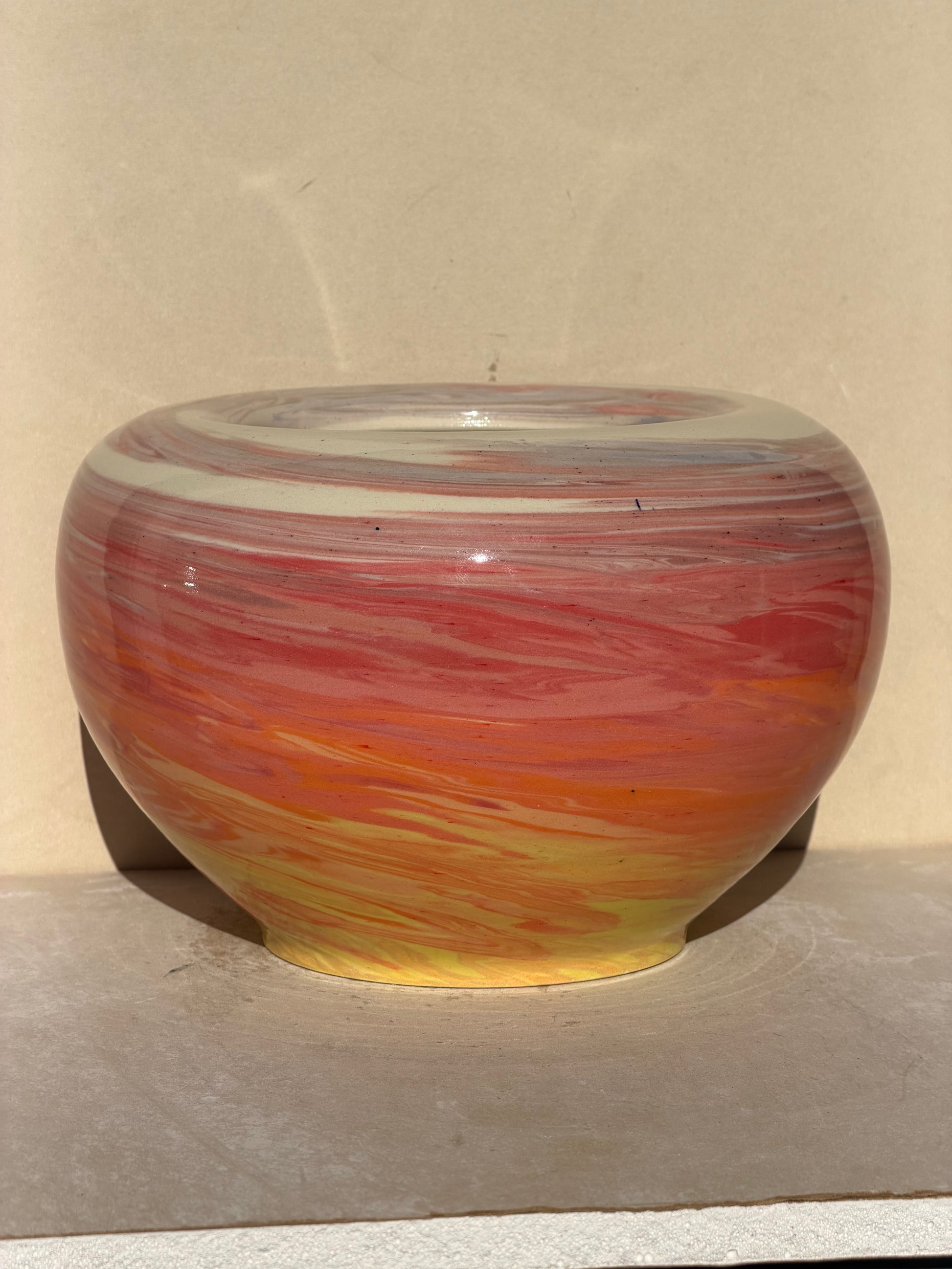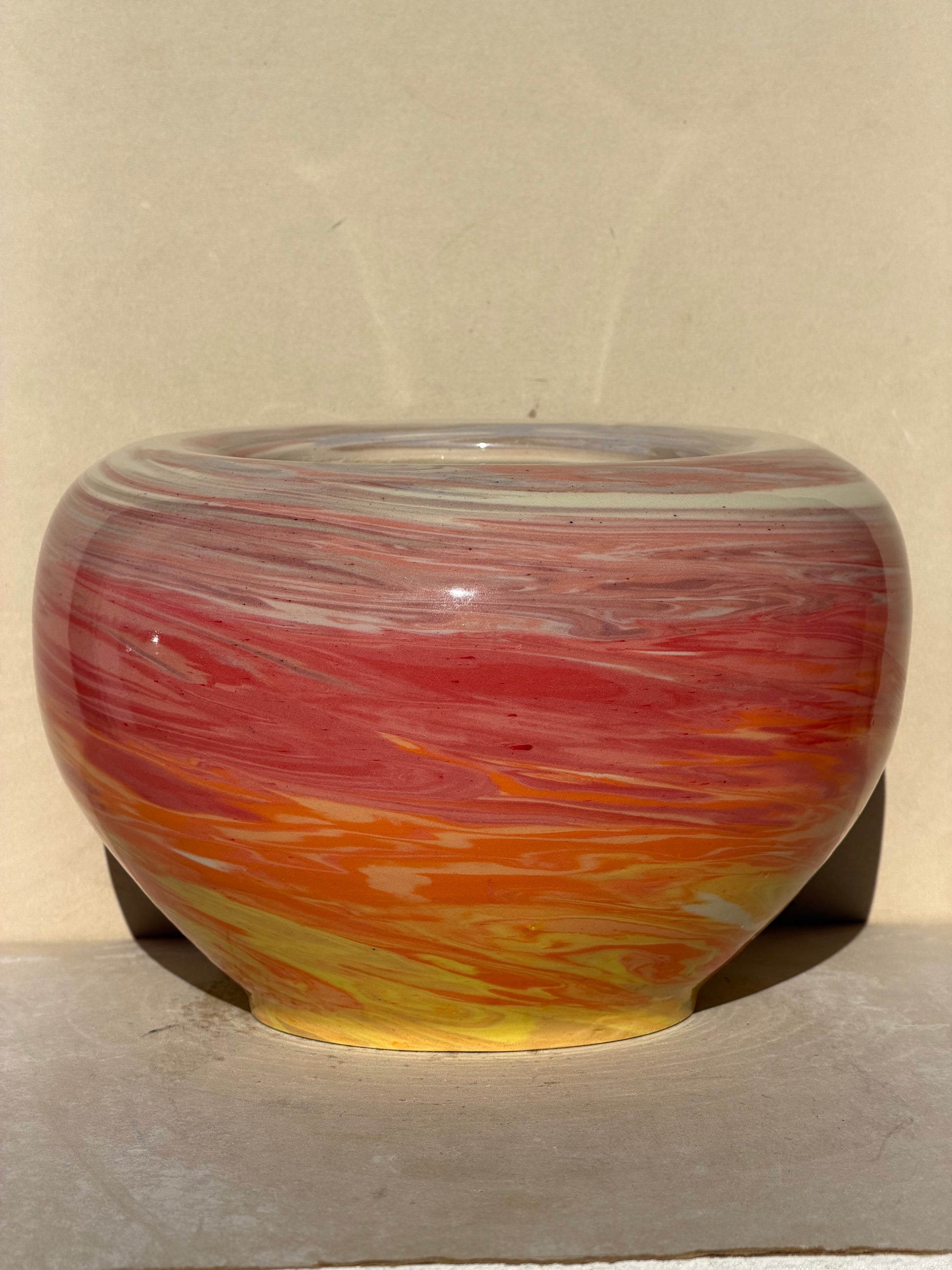 This piece is part of the Dusk Series within the Sky Collection. It is made using fifteen different colored clays and five distinct nerikomi patterns, working together to reflect the vibrant, fading light of the sky. The Dusk Series consists of 4 pieces.