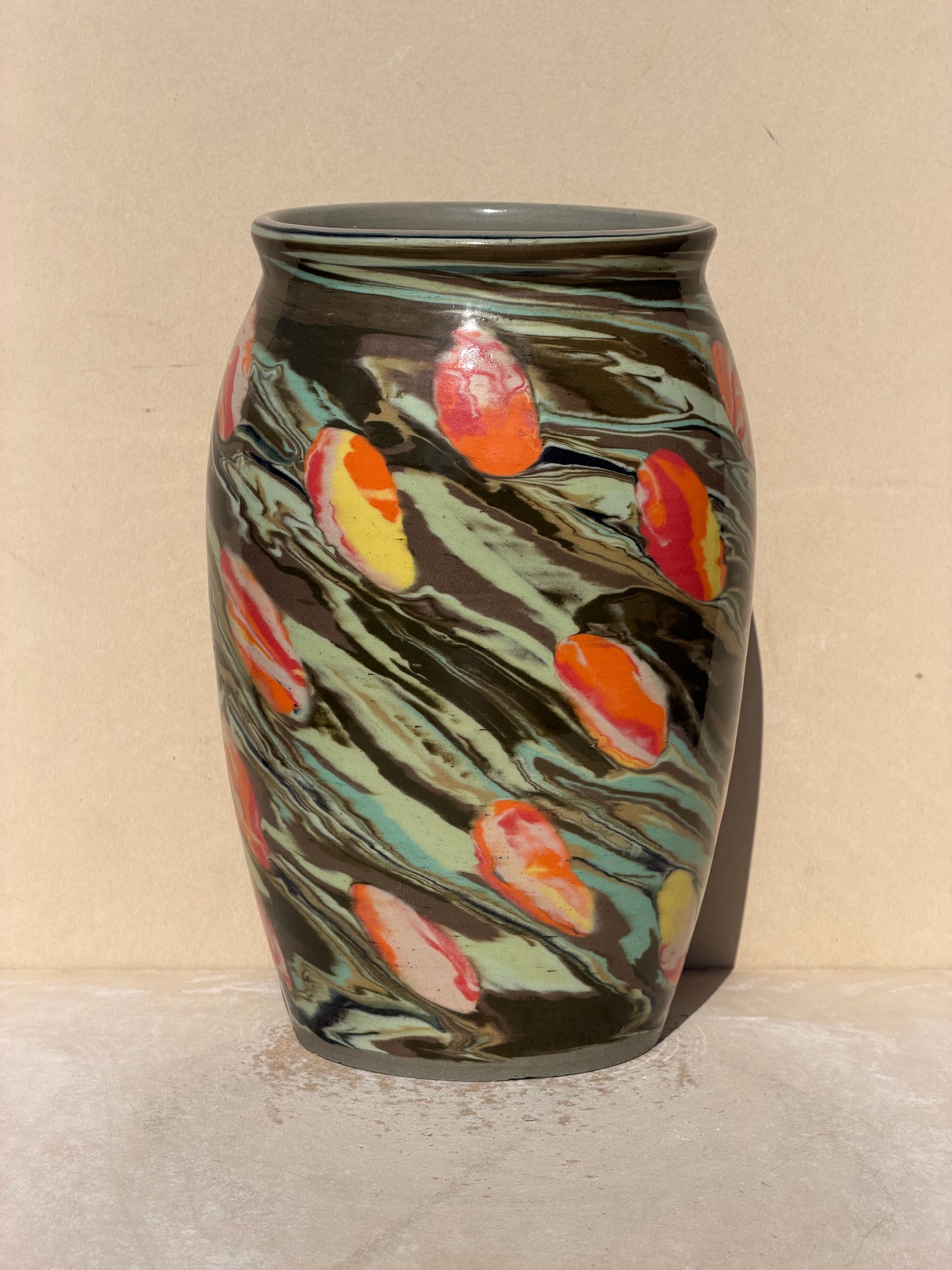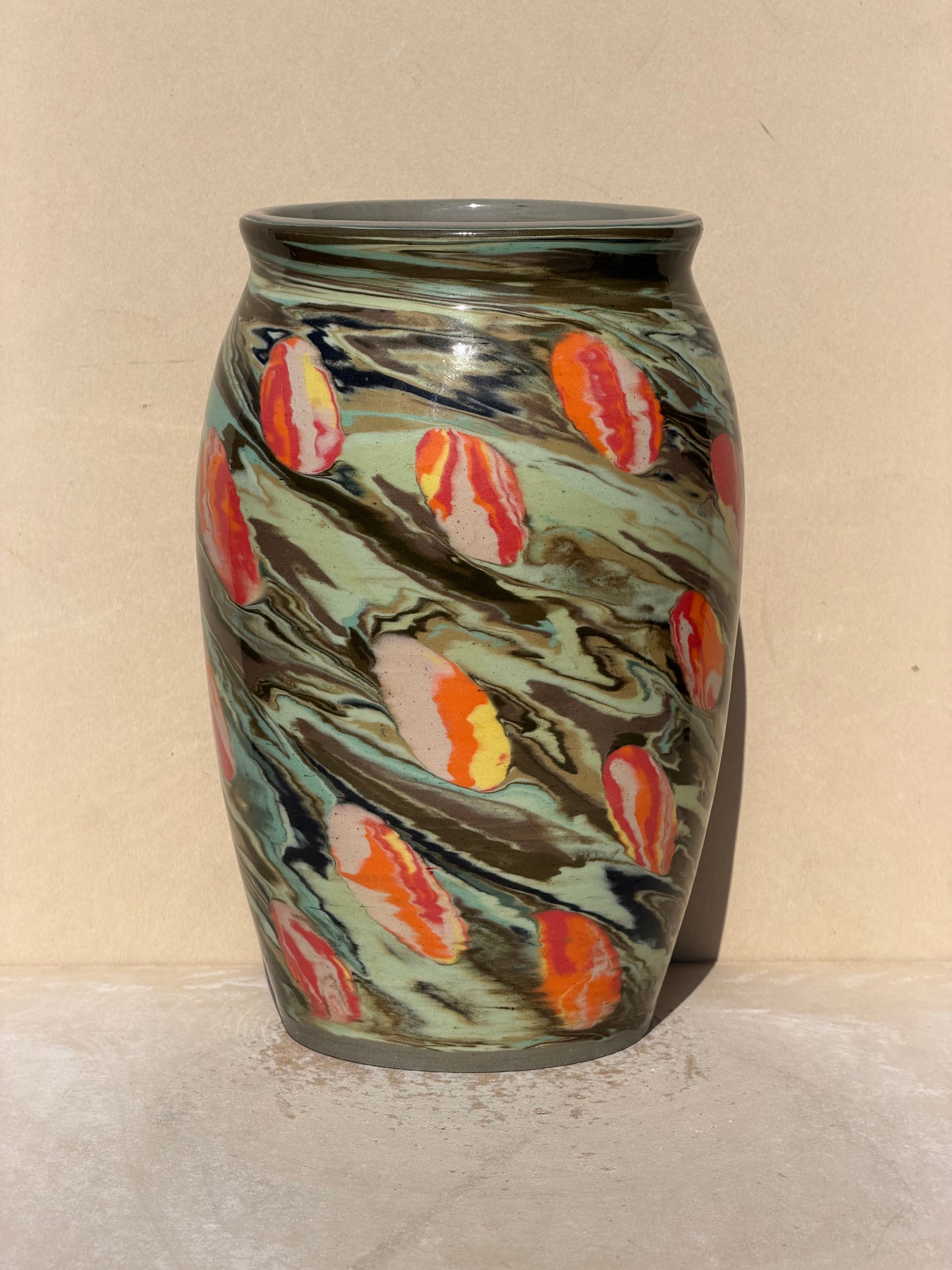 This vase was made using a mix of 2 techniques. The base is made of a bunch of green colored clay in a marble design. After throwing a cylinder I added Nerikomi pieces of a vibrant colors pattern and finished throwing the piece.
