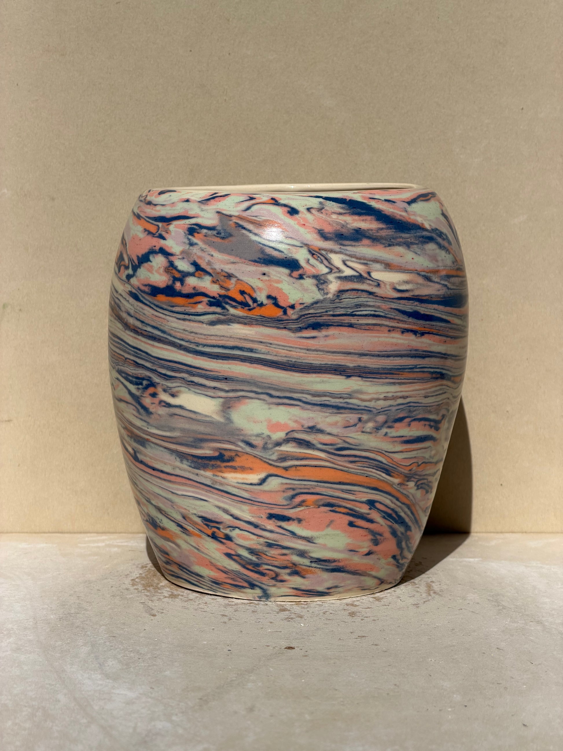 The pattern was formed from a collection of clay scraps left over from another body of work. After rehydrating the trimmings and reforming them together, a nerikomi pattern emerged. I used that as a the pattern I laid on the clay to throw this vase. Piece is not completely circular or level on the top. It does sit flat.