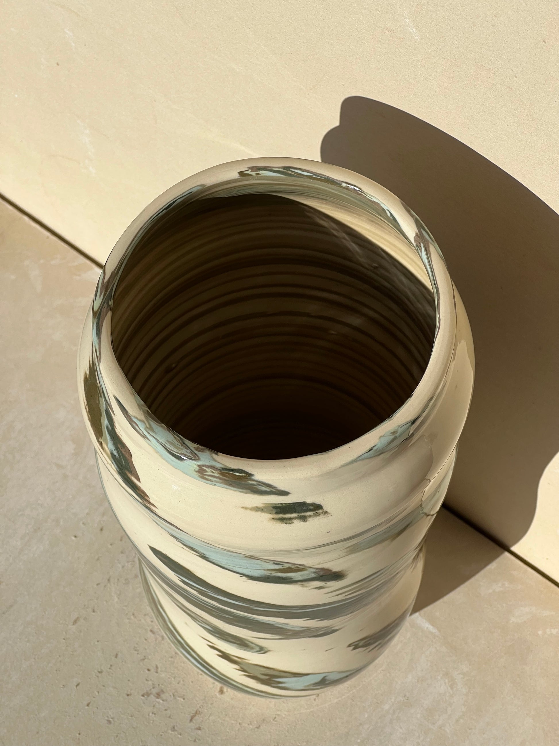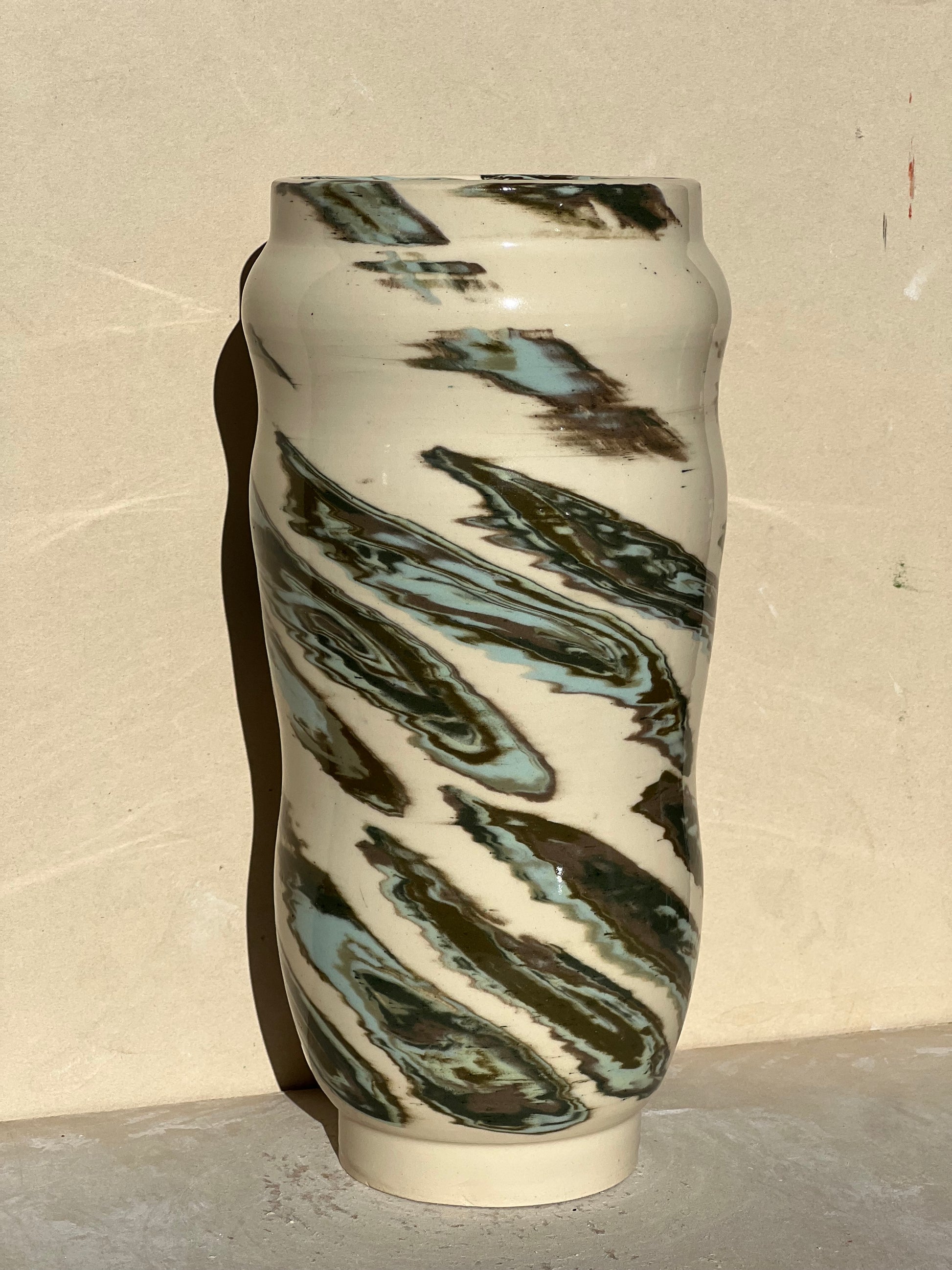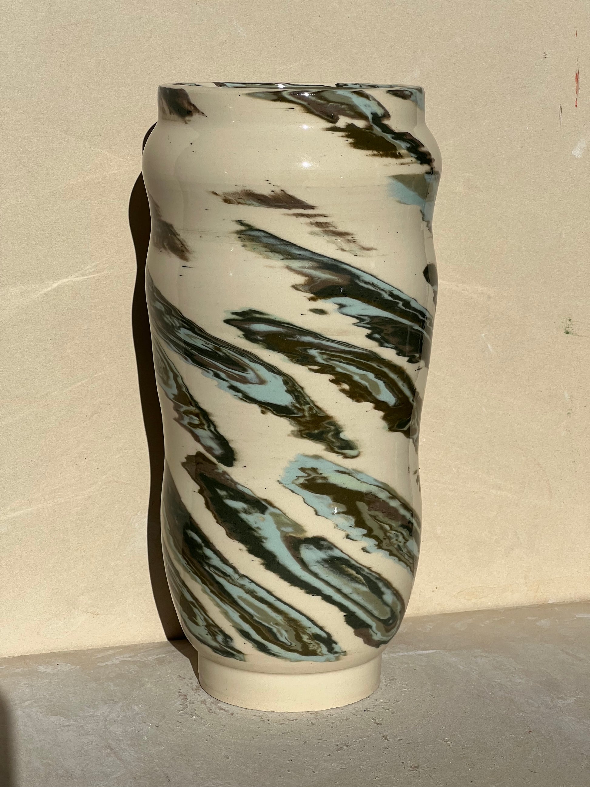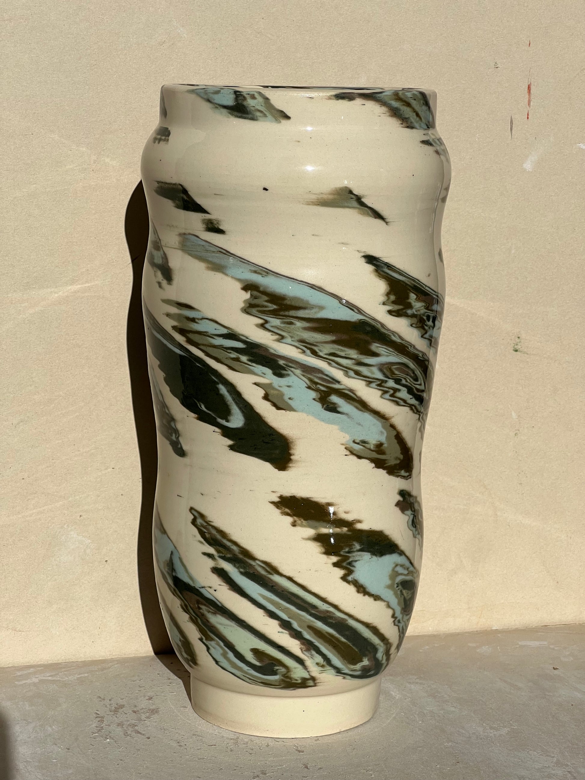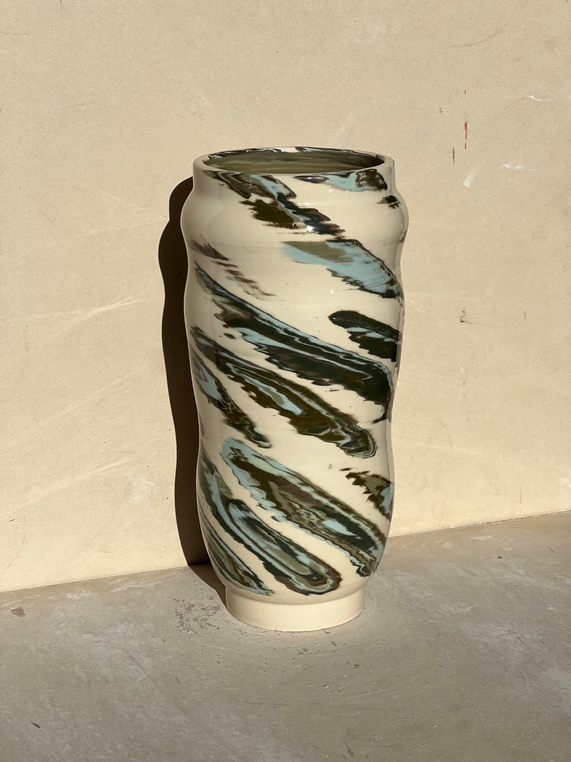 Made with a green marbled nerikomi pattern of all my green clays. Pattern was made using 35 different layers of green
