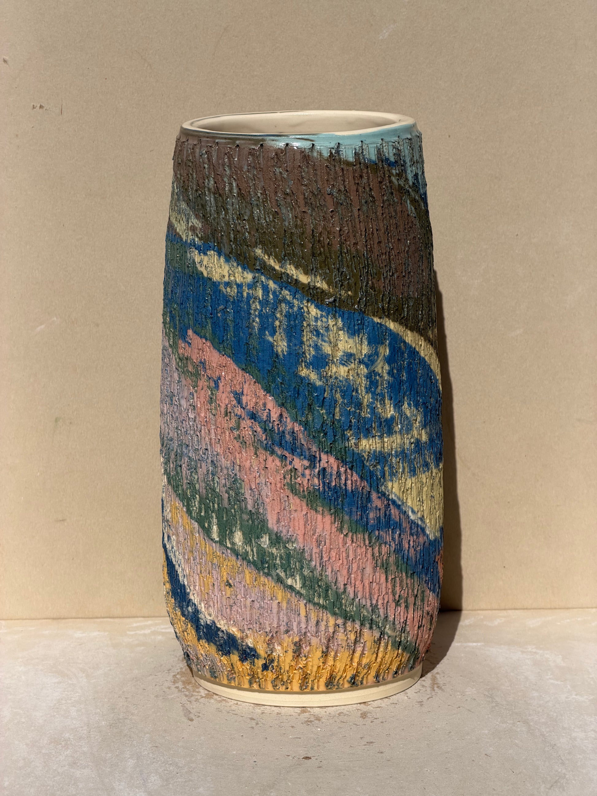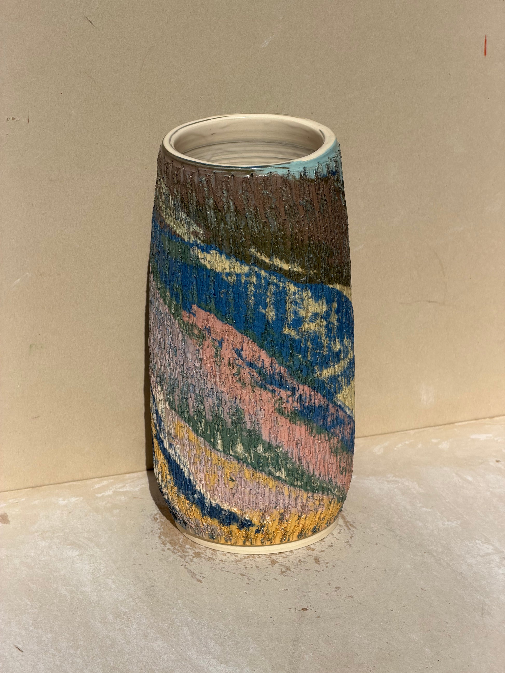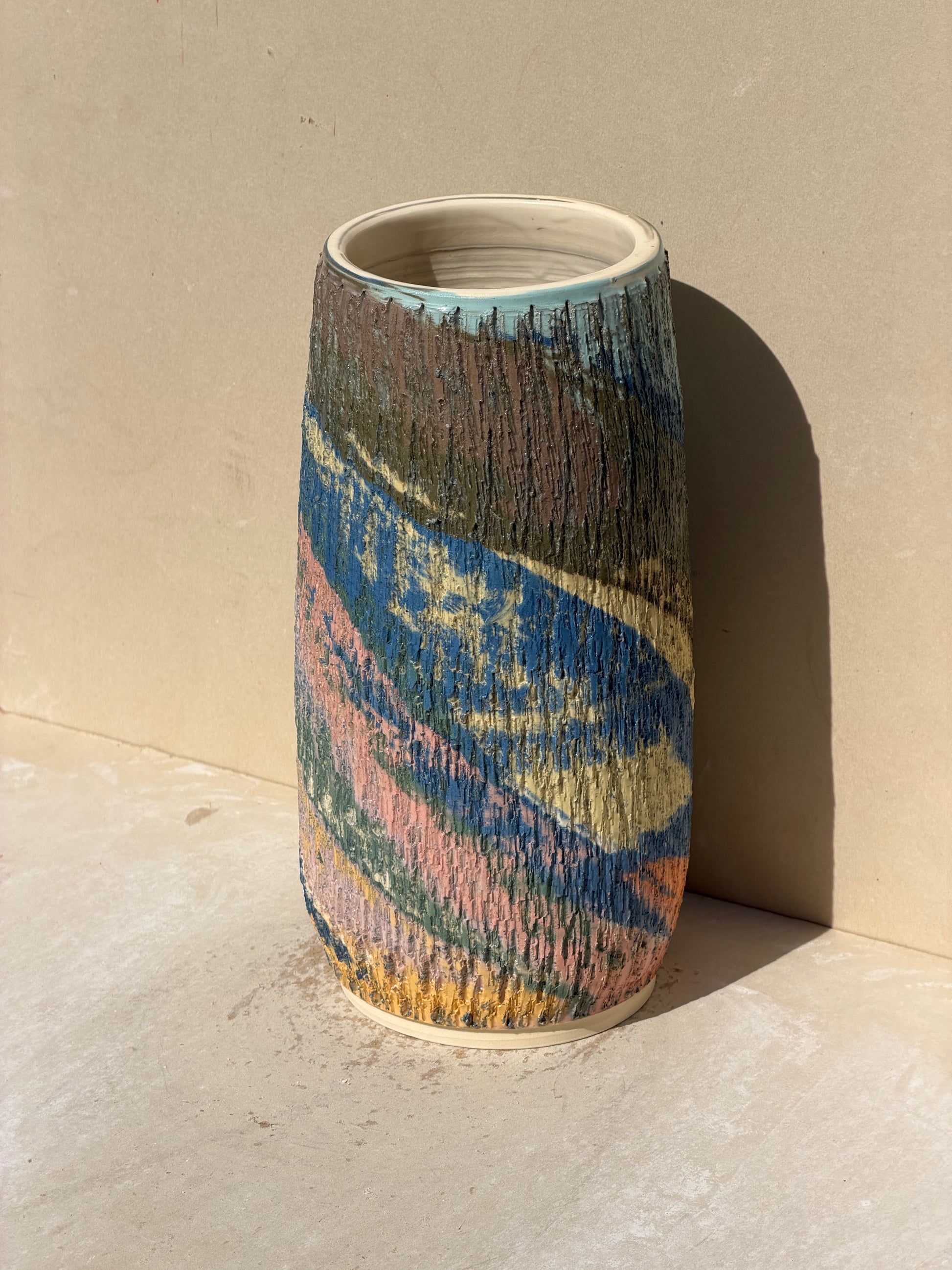 This piece is part of the textured series. Interior is white clay, piece is water tight. Created by throwing a cylinder and then adding texture to the clay. Afterward, I finished shaping the piece using one hand from the interior.