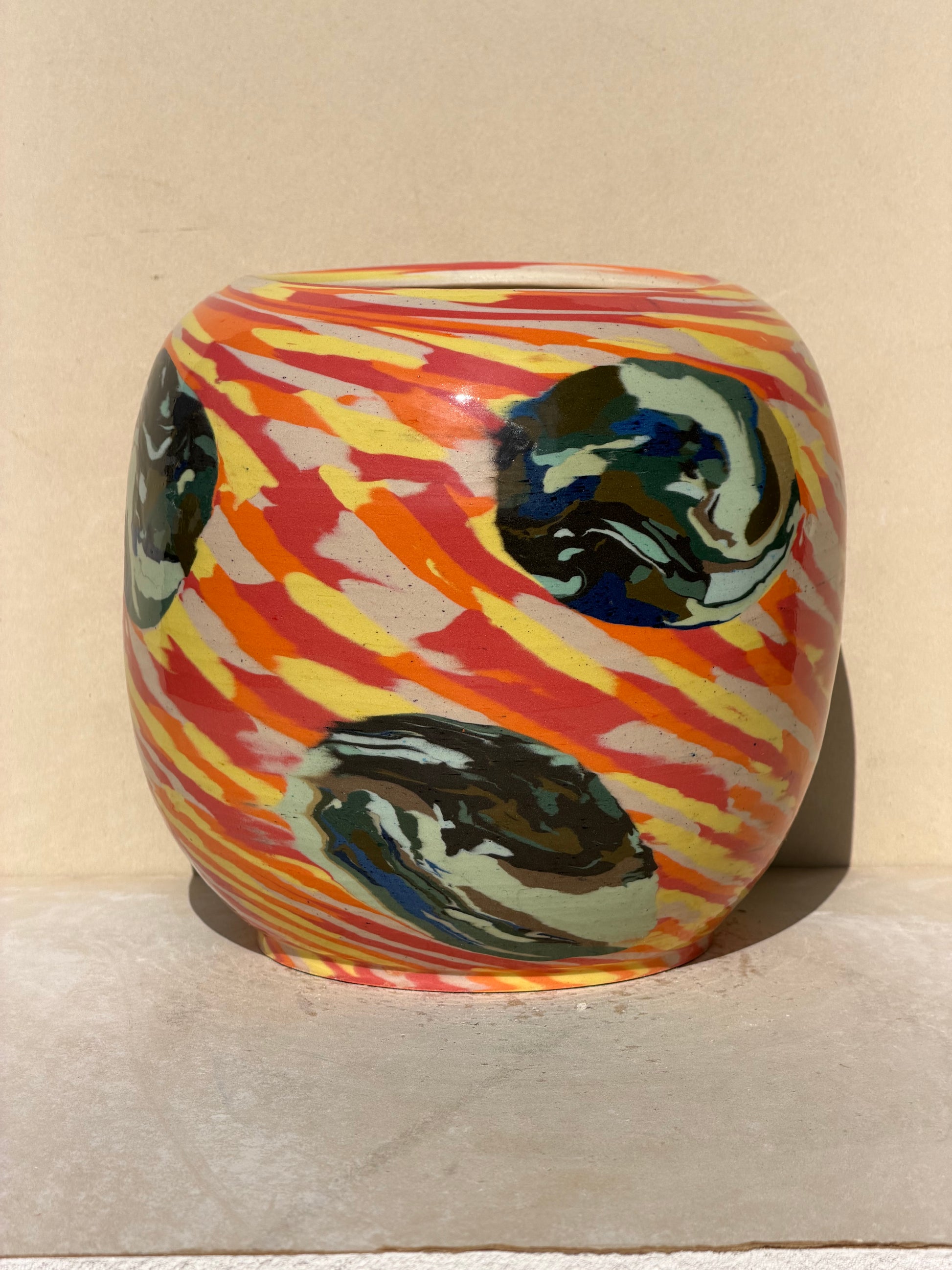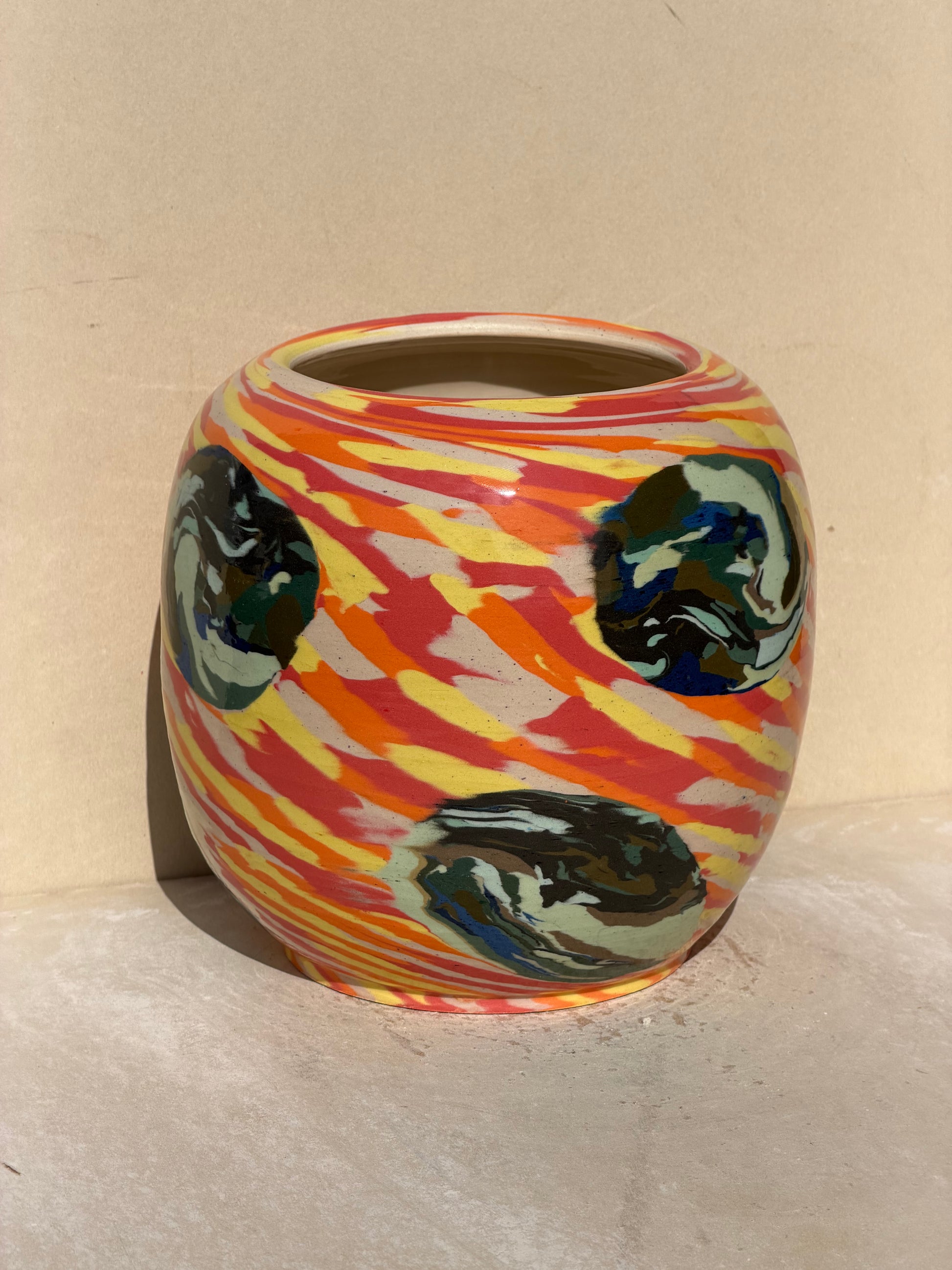 Created using a vibrant Nerikomi pattern for the base pattern and a separate blue and green nerikomi pattern for the circles. I threw the base cylinder with the vibrant pattern and then added the other nerikomi design to it. After pressing that in I finished throwing the vase.